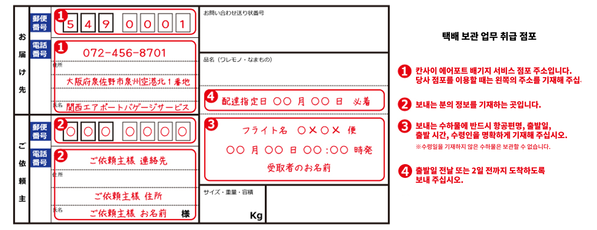 * 4일 이상 전에 도착한 경우, 공간이 부족하면 수령하기 어렵습니다 - 보내는 수하물에는 반드시 ‘항공편명’, ‘출발 일시’, ‘수령인명’을 기재해 주십시오. * 출발일이 불분명한 수하물은 보관할 수 없습니다